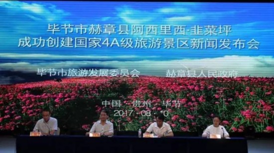 发布会现场 根据贵州省旅游资源规划开发质量评定委员会公告,阿西里西·韭菜坪景区(即大韭菜坪云上花海)于2017年8月9日荣膺国家4A级旅游景区,由此,毕节的国家4A级旅游景区增至4个。 阿西里西·韭菜坪景区位于贵州省西北部赫章县兴发苗族彝族回族乡境内,指的是大韭菜坪(云上花海)景区。景区内有着世界上最大面积的野生韭菜花——多星韭花带,是“花海毕节”的重要组成部分。每年8、9月份,万亩野生韭菜花相继盛开,随风舞动,成了浅紫色的海洋,与山峰、蓝天和白云构成贵州屋脊上一幅独特而又美丽的画卷,因此,阿西里西·韭菜坪景区被誉为东方的“普罗旺斯”。
