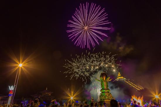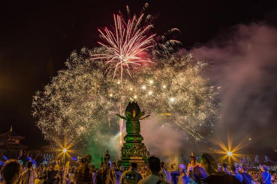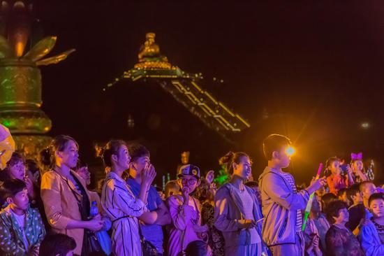 七夕节是中国传统节日中最具浪漫色彩的一个节日,龙口南山景区着力打造七夕烟花灯光音乐节,祈福传灯法会,音乐篝火狂欢派对,浪漫烟花雨,还有全新升级的唯美灯光秀,让所有人在这里体验一场浪漫之旅,度过一个甜蜜之夜! 8月28日晚的龙口南山景区可谓是热闹非凡,经过一天雨水的洗涤,夜晚的南山更显空灵清新。活动开场前,南山老人在景区入园广场为大家带来了精彩的黄梅戏《天仙配》,以此来祝愿天下有情人终成眷属。7点一到,祈福传灯法会在南山大佛下神圣而庄重的开始。大家手捧莲花灯漫步在大佛脚下,在南山大佛前供灯。“灯”是佛门六种供具之一,以“一灯能破千年暗”为象征,通过“灯灯相传,传灯无尽”传递美好的愿望。不少游客自愿参与到传灯队伍中,在佛祖前许下爱的心愿为爱立誓,为美好明天祈福。 传灯法会过后,紧接着就是场面盛大的千人音乐篝火狂欢派对,伴随着热情、动感的音乐,所有人围着熊熊燃烧的篝火狂欢起舞,嗨唱情歌,充分释放激情,大胆表达爱意!火光冲天,点燃激情,全场沉浸在一片欢乐的海洋中。现场还有神秘沙画秀和动感十足的非洲鼓表演,观众在前排导游的带动下,随机跳动舞姿,全场感受非洲音乐的动感与激情。 景区还为游客准备了嗨摇手机赢大奖的环节,价值两千元的斯柯达精致车模,南山庄园葡萄酒等丰富礼品全部送出,让游客满载而归。 大型浪漫异形烟花秀在万众期待的倒数声中一炮冲向天空,比以往造型更多变,色彩更夺目,场面更宏大!上千发烟花在现场优美的音乐中呈现出七彩浪漫,同时景区内的动感喷泉打开,喷涌而出的水柱激烈、壮观,配合着烟花不同的造型与色彩,将现场气氛推向高潮! 浪漫灯光与绚烂烟火打造迷人光影世界,篝火晚会与音乐派对嗨翻全场,带给现场数千人一份非比寻常的七夕记忆!