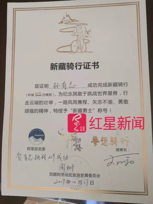在做志愿者的闲暇中,他开始摆摊攒钱,准备买一辆自行车送给自己,“我摆摊卖东西,赚了几千块钱。”最后他用赚来的钱买了一辆山地自行车,这也是孙有志拥有的第一辆自行车。 谈起骑行中记忆犹新的事,孙有志讲述了2016年骑行川藏线最后50公里发生的一件事。因为缺乏经验,8月6日这天,一行人的补给断了,“我们一行三人就剩下一罐能量饮料。”最终,靠着这一罐饮料的激励,他们顺利抵达珠峰大本营。