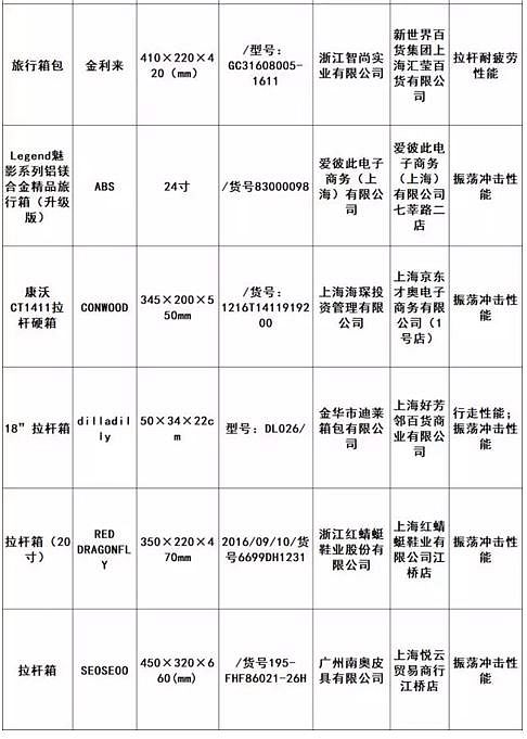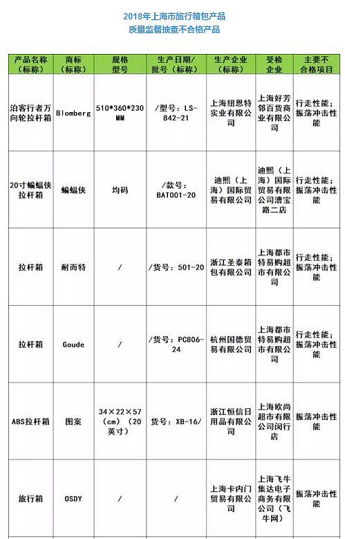 本次共抽查30批次产品,其中上海本地生产16批次,外省市生产14批次,经检测共有12批次不合格,抽样合格率仅为60.0%。其中不合格项目为振荡冲击性能、行走性能和拉杆耐疲劳性能。其中不乏有泊客行这类请明星代言,知名度较高的产品。