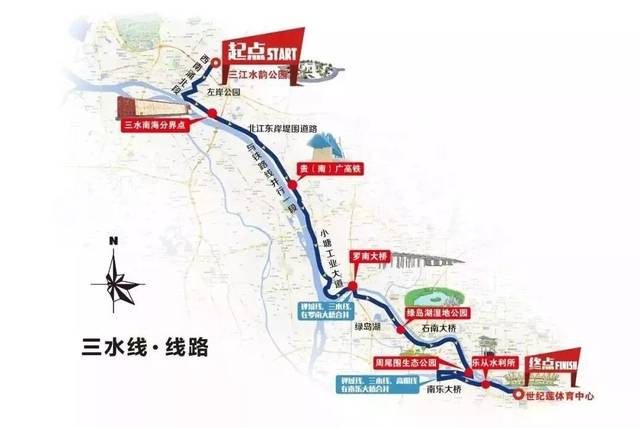 ▼ 三水线(全程约47公里) 三江水韵广场(起点)——三水南海分界点——贵广高铁下——绿岛湖湿地公园——周尾围生态公园——乐从水利所——世纪莲体育中心(终点)。