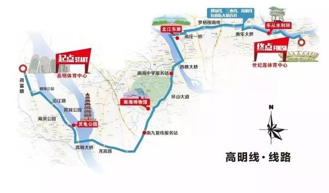 ▼ 高明线(全程约47公里) 高明体育中心(起点)——灵龟公园——南海博物馆——北江东岸——乐从水利所——世纪莲体育中心(终点)。