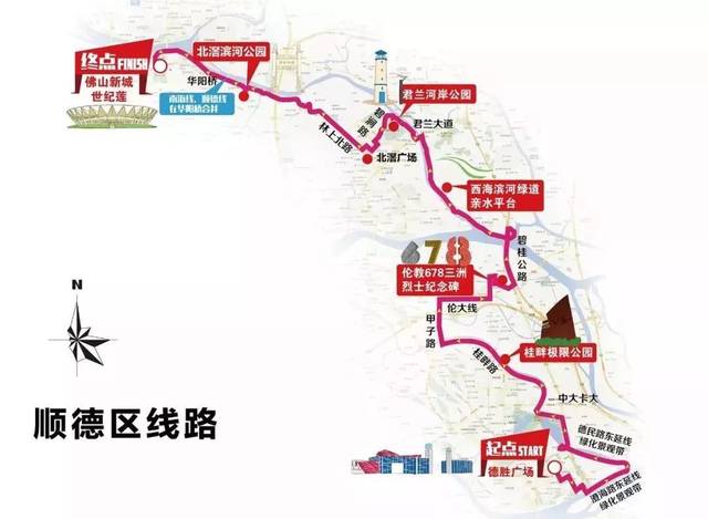 全民健身,五区开走, 一齐徒步穿越佛山! 今年的线路已经公开, 街坊们期待的顺德线是这样子的↓↓↓ ▼ 顺德线(全程约47公里) 德胜广场(起点)——顺峰山公园——桂畔极限公园——伦教678三洲抗日烈士纪念碑——西海亲水平台——君兰河岸公园——北滘河滨公园——世纪莲体育中心(终点)。