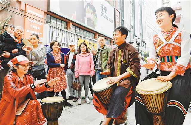 3月30日,第22届重庆都市旅游节暨城际旅游交易会(简称“一会一节”)在重庆金源购物广场和解放碑步行街拉开帷幕。本届“一会一节”以“畅游多彩世界·惠萃山水之都”为主题,吸引了英国、日本、匈牙利、意大利等国家和地区,以及国内众多省市的景区、酒店、旅行商、航空公司参展。图为在渝中区解放碑步行街,来自云南的佤族小伙和纳西族女孩用非洲鼓表演进行旅游推介。 记者 张锦辉 摄 (详见4版) |