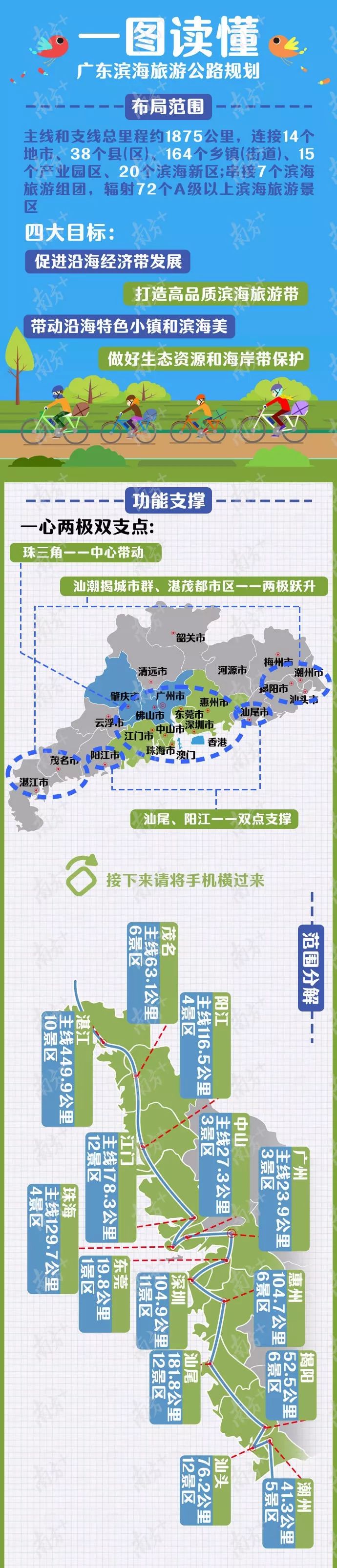 说起滨海公路,您会想起哪里? 是一边惊涛拍岸, 一边悬崖峭壁的加州一号公路? 还是一边碧波万顷, 一边层峦叠嶂的台湾苏花公路? 不用再羡慕别人家的滨海公路了, 这一切很快就会在广东实现! 刚刚公布的广东滨海旅游公路规划中显示,位于广东的全球最长滨海公路将于后年全面开建! 广东将建造全球最长滨海公路 图自 视觉中国 全长1875公里全球第一, 连接14个地市、38个县(区)、 164个乡镇(街道)、15个产业园区、 20个滨海新区, 串接7个滨海旅游组团, 辐射72个A级以上滨海旅游景区, …… 据去年初步的统计, 驱车走完滨海公路全程需要7天时间!! 广东滨海公路规划图(绿色虚线部分) 图自 湛江日报 2017/08/05 这条全球最长的滨海公路,串接广东沿海14个地市,辐射沿线规划的20个滨海新区,连通90个旅游景区,与沈海高速公路一起形成提供差异化服务、功能互补的沿海复合型公路走廊,对全面提升我省滨海地区的交通运输服务水平、提振沿海经济带发展、推动“海洋-海岛-海岸”旅游立体开发、促进滨海旅游转型升级、补齐广东沿海经济带和旅游休闲带发展“短板”具有重要支撑作用,将为广东沿海社会经济发展注入新的活力。 来来来, “一图读懂”全球最长滨海公路! 制图 南方+ 到滨海旅游公路14个地市 玩什么?(规划详情) 1 潮州市 滨海公路主线长约41.3公里,支线长9.1公里,经过大埕、所城、柘林、汫洲、海山等5个镇及饶平县城。 ——辐射金狮湾港区、西澳港区、三百门港区等3个港区。 ——辐射大埕湾碧海银滩、古哨大所城、金狮湾度假村、西澳岛的“白鹭天堂”、海山镇“中华海龙”旅游区等5处旅游景区。 2 汕头市 滨海公路主线长约76公里,支线长76公里,经过澄海市东里、溪南、莲上、莲下、凤翔,龙湖区外砂、新溪,汕头海湾新区、华侨经济文化合作试验区、濠江区广澳、滨海,汕头保税区,潮阳区海门,潮南区井都、陇田。 ——辐射南澳港区、广澳港区、海门港区等3个港区。 ——辐射12处旅游景区,其中3A及以上的有南澳海岛国家森林公园、礐石风景名胜区(4A)、中信汕头高尔夫俱乐部、莲花峰风景名胜区。 3 揭阳市 滨海公路主线长约52.5公里,经过仙庵镇、靖海镇、前詹镇、神泉镇等4个镇及揭阳城市副中心、大南海石化工业区。 ——辐射惠来沿海港区的南海作业区、神泉作业区、前詹作业区、资深作业区、靖海作业区等5个作业区。 ——辐射金狮湾旅游度假区、海角甘泉、靖海古堡、靖海炮台、客鸟尾石笋、石碑山灯塔等6处旅游景区。 4 汕尾市 滨海公路主线长181.8公里,支线长8.5公里,经过陆丰甲东镇、甲子镇、甲西镇、湖东镇、碣石镇、金厢镇、陆丰县城东海镇、潭西镇、上英镇、海丰大湖镇、汕尾新区田乾镇、遮浪镇、捷胜镇、汕尾市城区、马宫镇、鲘门镇、深汕特别合作区、小漠镇等18个城区及乡镇。 ——辐射陆丰港区、汕尾新港区、汕尾港区、海丰港区等4个港区。 ——辐射12处旅游景区,其中3A及以上的有碣石玄武山旅游区、凤山祖庙旅游区。 5 惠州市 滨海公路主线长104.7公里,经过惠东县黄埠镇、平海镇、铁涌镇、稔山镇、霞涌镇、澳头镇等6个镇及环大亚湾新区。 ——辐射惠东港区、东马港区、荃湾港区等3个港区。 ——辐射稔平半岛双月湾、平海南门海滨旅游区、三角洲旅游区、巽寮湾旅游区、亚婆角旅游区、海滨温泉旅游度假区等6处旅游景区。 cr. tabbintam 6 深圳市 滨海公路主线长104.9公里,支线长25.9公里,经过大鹏新区、盐田区、罗湖区、福田区、南山区、宝安区等6个区及前海新区。 ——辐射大鹏港区、盐田港区、南山港区、大小铲岛港区、大铲湾港区、宝安港区等6个港区及深圳宝安国际机场和深圳太子湾邮轮母港。 ——辐射11处旅游景区,其中3A及以上的有大鹏半岛金沙湾海滨度假区、东部华侨城、仙湖植物园、地王观光深圳之窗、锦绣中华、中国民俗文化村、世界之窗、青青世界旅游区、海上田园旅游区。 7 东莞市 滨海公路主线长19.8公里,经过长安镇、虎门镇2个镇及滨海湾新区。 ——辐射东莞港长安港区、沙角港区2处港区。 ——辐射威远岛风景名胜区1处旅游景区。 8 广州市 滨海公路主线长23.9公里,经过南沙新区南沙街道、万顷沙镇等2个镇街及明珠湾新城。 ——辐射南沙港区及广州港南沙港区国际邮轮码头。 ——辐射南沙滨海湿地景区、百万葵园主题公园、南沙天后宫等3处旅游景区。 9 中山市 滨海公路主线长27.3公里,经过民众镇、翠亨新区、南朗镇等3个镇及新区。 ——辐射中山港区、马鞍港区等2个港区。 ——辐射孙中山故居纪念馆、中山詹园景区等3个旅游景区。 cr. Rocky 10 珠海市 滨海公路主线长129.7公里,支线长7.1公里,经过唐家湾新城、珠海市区吉大、拱北、南坪、湾仔、横琴新区、三灶新城、金湾新城、南水、平沙、富山新城等11个镇街及城区。 ——辐射唐家港区、香洲港区、九州港区、洪湾港区等5个港区。 ——辐射凤凰山风景名胜区、农科奇观、圆明新园景区、横琴岛风景名胜区等4处旅游景区。 11 江门市 滨海公路主线长178.3公里,经过斗门、都斛、赤溪、广海、川岛、海宴、汶村、北陡等8个镇及银湖湾滨海新城、广海湾工业新城。 ——辐射新会港区、广海湾港区等2个港区。 ——辐射12处旅游景区,其中3A及以上的有古兜温泉综合度假区、富都温泉度假邨