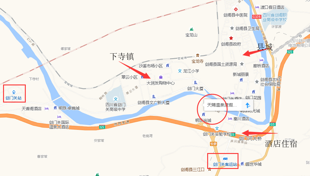 在剑门关的汽车(或公交)基本属于坐满就走那种,如果人少的话会等有点久,剑门关景区到剑阁县城(高铁站)的交通挺多的,高铁站直达景区公交车7路,其中也要路过天赐温泉,但注意的是18点之后就没有公交车了。剑门关风景区南门、北门,有很多小车、大巴车可以过去,大概5块钱左右。 不管是坐高铁还是汽车,在这里我多说下“剑门关,剑阁县,下寺镇、普安镇的地理关系”。