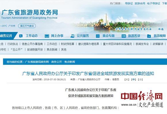 经济日报-中国经济网北京8月7日讯 近日,广东省人民政府办公厅发布《广东省促进全域旅游发展实施方案》。据经济日报-中国经济网文化产业频道(微信号:cewenhua)了解,该《方案》主要目标是到2020年,优质旅游产品更加丰富,新增省级以上旅游度假区10家,形成若干个旅游产业集聚发展功能区,建成一批国际品牌酒店、高星级饭店、精品民宿,乡村旅游休闲度假功能更加完善,乡村旅游接待人数达5.2亿人次,乡村旅游总收入达2200亿元。旅游产业综合竞争力明显增强,省级以上全域旅游示范市、县(市、区)达到20个,全省接待过夜游客5亿人次以上,旅游总收入达1.6万亿元,旅游业增加值占GDP的比重达7%,涉旅行业完成固定资产投资占全省15%以上。有四个主要任务:(一)优化全域旅游大格局。 (二)打造全域旅游大品牌。 (三)培育全域旅游大产业。 (四)构建公共服务新体系。七项扶持政策:(一)加强资金支持。(二)加强旅游用地保障。(三)支持利用林场资源发展旅游。(四)支持扩大旅游消费。(五)深化旅游“放管服”改革。(六)支持旅游科技创新。(七)加强旅游人才培养引进。 四项保障措施。>>>更多政策可查看中国经济网“中国文化产业政策库” 以下为《通知》和《方案》全文。 广东省人民政府办公厅关于印发广东省促进全域旅游发展实施方案的通知 各地级以上市人民政府,各县(市、区)人民政府,省政府各部门、各直属机构: 《广东省促进全域旅游发展实施方案》已经省人民政府同意,现印发给你们,请认真贯彻落实。实施过程中遇到的问题,请径向省旅游局反映。 广东省人民政府办公厅 2018年7月27日 《广东省促进全域旅游发展实施方案》 为充分发掘全省旅游资源,激发市场活力,加快全域旅游发展,进一步发挥旅游对发展经济、增加就业的重要作用,更好满足人民日益增长的美好生活需要,根据《国务院办公厅关于促进全域旅游发展的指导意见》(国办发〔2018〕15号)和省委十二届四次全会精神,制定本实施方案。 一、总体要求 (一)指导思想。 以习近平新时代中国特色社会主义思想为指导,全面贯彻党的十九大和十九届二中、三中全会精神,深入贯彻习近平总书记重要讲话精神,紧紧围绕统筹推进“五位一体”总体布局和协调推进“四个全面”战略布局,牢固树立和贯彻落实新发展理念,践行“绿水青山就是金山银山”理念,将全域旅游作为推动全省经济社会发展的重要抓手,将乡村旅游作为落实乡村振兴战略的重要手段,全区域规划、全产业发展、全要素配套、全社会推进,着力推动旅游业从门票经济向产业经济转变,从粗放低效方式向精细高效方式转变,从封闭的旅游自循环向开放的“旅游+”转变,从企业单打独享向社会共建共享转变,从景区内部管理向全面依法治理转变,从部门行为向政府统筹推进转变,从单一景点景区建设向综合目的地服务转变,实现全域宜居、宜业、宜游,打造粤港澳世界级旅游休闲湾区和广东世界旅游休闲目的地,为广东实现“四个走在全国前列”作出积极贡献。 (二)主要目标。 到2020年,优质旅游产品更加丰富,新增省级以上旅游度假区10家,形成若干个旅游产业集聚发展功能区,建成一批国际品牌酒店、高星级饭店、精品民宿,乡村旅游休闲度假功能更加完善,乡村旅游接待人数达5.2亿人次,乡村旅游总收入达2200亿元。旅游产业综合竞争力明显增强,省级以上全域旅游示范市、县(市、区)达到20个,全省接待过夜游客5亿人次以上,旅游总收入达1.6万亿元,旅游业增加值占GDP的比重达7%,涉旅行业完成固定资产投资占全省15%以上。 到2025年,广东旅游品牌的国际影响力进一步提升,珠三角都市旅游发展核、滨海旅游产业带、北部生态旅游区和粤港澳世界级旅游休闲湾区功能更加完善,全面实现旅游发展全域化、旅游供给品质化、旅游治理规范化、旅游效益最大化,建成全域旅游示范省,初步建成世界旅游休闲目的地。 二、主要任务 (一)优化全域旅游大格局。 加强规划统筹,优化“一核、一带、一区、一湾”全域旅游发展空间布局。 ——一核:珠三角都市旅游核。以广州、深圳为中心,以广佛肇、深莞惠、珠中江三大旅游圈为重点,推进珠三角地区旅游产业一体化,打造珠三角都市旅游核。珠三角各地级以上市持续优化旅游产业结构、提升经营管理水平、完善公共服务设施,推动旅游产业规模、产业竞争力、综合效益达到国际领先水平,形成资源要素优化配置、各具特色、协调发展的都市旅游格局。 ——一带:滨海旅游产业带。以环雷州半岛、环珠江口、川岛-银湖湾、海陵岛-水东湾、大亚湾-稔平半岛、红海湾-碣石湾、汕潮揭-南澳“七组团”为重点,打造广东特色的滨海旅游产业带。加强“海洋-海岛-海岸”旅游立体开发,优化提升滨海旅游产品,完善配套设施建设,打造复合型公路旅游休闲廊道。 ——一区:北部生态旅游区。以环丹霞山、环罗浮山-南昆山、环鼎湖山、环天露山、环云雾山-云开山、环凤凰-莲花山脉等“六圈”为重点,打造北部生态旅游区。加快环南岭旅游公路建设,统筹开发建设西江、东江、北江、梅江-韩江四大绿色生态旅游画廊,系统布局生态风景道、游步道、营地驿站、停车场、旅游厕所等旅游基础设施,推动建设生态旅游目的地和打造生态旅游精品线路。 ——一湾:粤港澳世界级旅游休闲湾区。加强粤港澳旅游合