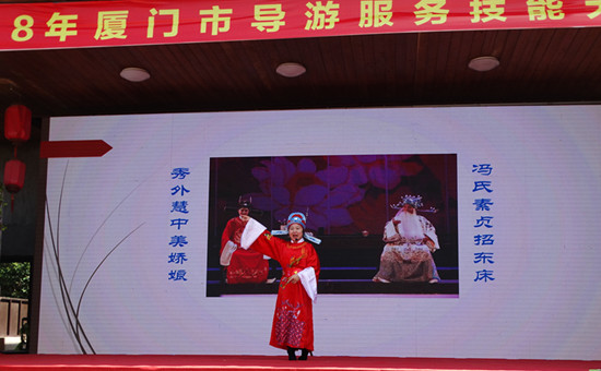 除了考核选手的专业技能外,选手们还纷纷拿出自己看家本领,展示自身特长,为现场观众带来了一场丰富精彩的表演。从优雅的花道、悠扬的古筝,到春江花夜月的武术,到动力十足的唱跳,再到诗情画意的朗诵,从古至今,从传统到现代,让大家意犹未尽,现场掌声连绵不绝。 导游,不仅是实现个人旅游梦想的职业,更代表一个城市的形象。大赛设置放飞梦想环节,要求选手们结合《关于深化导游体质改革加强导游队伍建设的意见》和《2017年全国旅游工作报告》,畅所欲言,谈谈导游职业发展愿景。选手们结合自身带团经历,声情并茂地向观众讲述他们对导游职业的理解,满腔热情地向观众描绘他们的导游职业梦想,向观众传递他们爱岗敬业的正能量传递,让观众感受他们对导游工作的热爱。 三、注重旅游安全和突发事件应对,提升导游综合素质 大赛力求在形式内容上有所创新。总决赛操作技能部分除了设置室内导游综合素质环节,还增加了户外的车上讲解部分。讲解内容主要有沿途美景、城市发展、历史文化、民俗风情等。岛内外资源相结合,既有体现厦门金砖会议元素的岛内环形线路,又有展现岛外旅游发展新业态的集美铛铛车旅游专线。选手们纷纷诠释了一张张美丽厦门的城市名片,全面展示自身讲解能力与服务水平。 本次大赛以“鹭岛匠艺 服务全域”为主题,自8月启动以来,历时两个多月,通过初选、笔式、复赛、强化培训,最后有20名选手脱颖而出,杀入总决赛。今年比赛主要呈现出以下几个亮点: