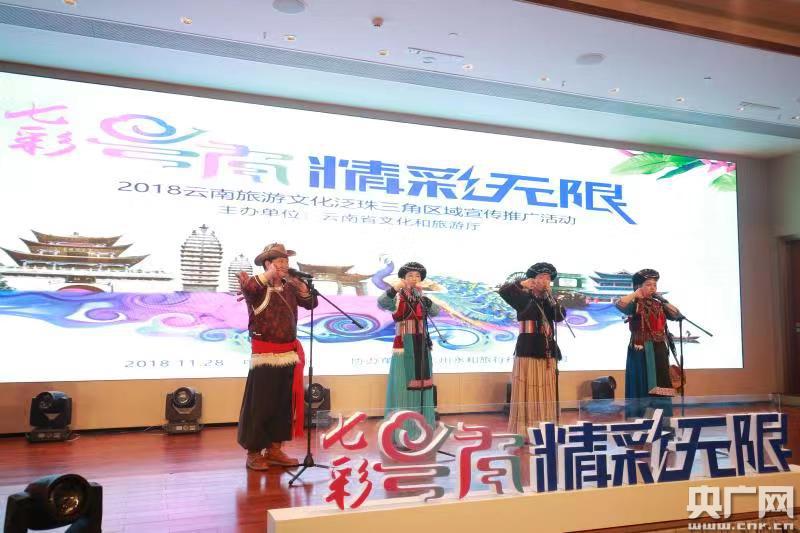 活动现场的民族歌舞表演。(央广网发 主办方供图) 数据显示,2017年云南全省接待广东省入滇游客1762.5万人次。广东省文化和旅游厅产业促进处副处长武晨表示,广东和云南一脉相承,两地旅游资源都十分富集,资源差异性、互补性强。希望双方在互为旅游目的地宣传、智慧旅游建设、旅游线路产品推广、分享旅游发展经验等方面广泛开展交流与合作,实现优势互补、客源互换、信息共享,互利互赢。