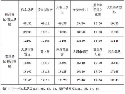 贾汪定制专线线路走向:徐州汽车总站--潘安湖湿地公园(迎春灯会民俗庙会美食节)--大洞山景区(茱萸寺)(民俗庙会)--茱萸养生谷(儿童游玩童趣园)--墨上集民俗文化园(赶大集)--大景山滑雪场(激情滑雪) 市民乘车地点:徐州市区——徐州汽车总站(蓝天大楼对面)售票大厅内旅游候车室;贾汪景区——潘安湖景区贾汪大道与G310交叉路口、大洞山景区门口、茱萸养生谷景区门口、墨上集民俗文化园景区门口、大景山滑雪场景区停车场。 购票热线:0516-80812918、80812900
