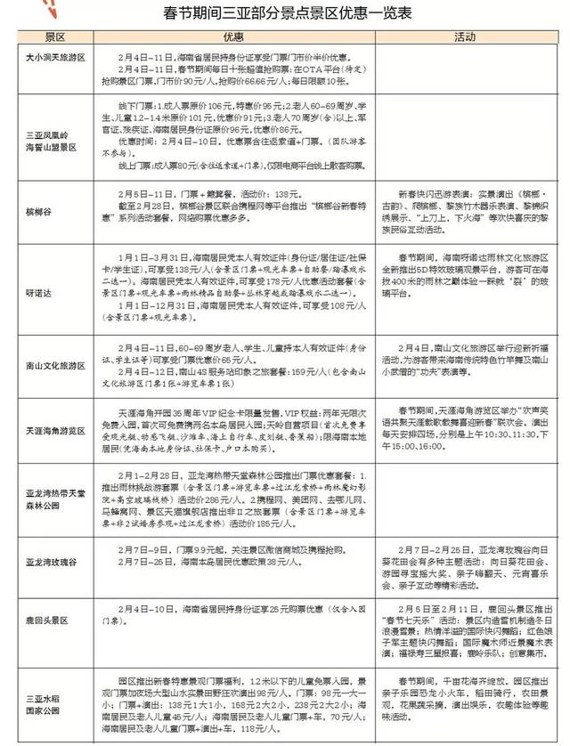 祝各位春节快乐 ◎三亚·亚特兰蒂斯度假酒店推出4天3晚冬令营套餐,套餐包含每日双人早餐、2大1小自助晚餐一次、2大1小水世界&失落的空间水族馆门票、3张4D电影体验券及2天迷你营冬令营活动。 B线:海南热带野生动植物园—冯塘绿园 景点景区优惠 桂林洋国家热带农业公园 滨海夜游 海口骑楼老街 年味古韵文艺游 2、免票:老人70周岁(含)以上、现役军人、记者证、残疾证、旅客运输资格证、导游资格证(本省免票、外省半价) 春节期间,在三亚都有啥 海南热带野生动植物园 冼夫人文化节 海口巴萨世界、NBA互动体验馆、泰迪熊博物馆。 ◎蜈支洲岛旅游区2月5日-11日在船说广场(岛上)开展“金猪送福”活动,在基地大门口(岛下)开展“新春抢红包”活动。 A线:观澜湖华谊冯小刚电影公社—观澜湖新城—火车头万人海鲜广场 海南热带野生动植物园特别设计以大熊猫为主题的三个互动小游戏,让游客朋友感受与大熊猫共度春节的喜悦。 ◎2019首届三亚光影艺术彩灯大庙会在三亚市天涯区海虹路8号凤凰海鲜广场举行,活动持续至2月24日。 到三亚过冬和过年