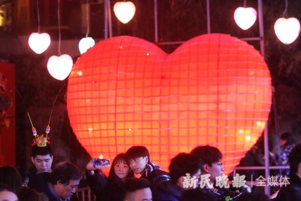 值得一提的是,灯会期间,除了南翔馒头店、绿波廊、上海老饭店等老城隍庙老字号,杏花楼、大壶春、鲜得来、真老大房、松鹤楼等一批新入驻豫园商城的老字号也为元宵观灯者带来新体验。 图说:豫园灯会迎来大批客流 新民晚报记者 周馨 摄(下同) 元宵节又称古代的情人节。昨晚,很多青年人、青少年身着华服走进豫园。很多年轻人纷纷来到“情人谷”灯组,在欢乐骑行的过程中点亮一颗巨大的红色爱心,纷纷拍照留念。同时,猜灯谜的走马灯、24节气灯、锦绣中华氛围灯等,又吸引了很多市民游客参与互动活动。 正月十五赏花灯、猜灯谜,吃汤圆也是非常重要的民俗之一。“春节期间,门店迎来大客流,每天平均卖出6万余只汤团。”宁波汤团店豫园商城店的店长徐正留笑道,昨日,店里售出10万余只汤团,除了甜馅的黑洋酥、咸馅的蟹粉鲜肉最受欢迎外,新推出的雨花石汤团(用咖啡粉、南瓜泥为原料,枣泥和核桃为馅料)已成为“网红”,每天下午不到三点就售罄。 图说:情侣们在超大爱心前合影