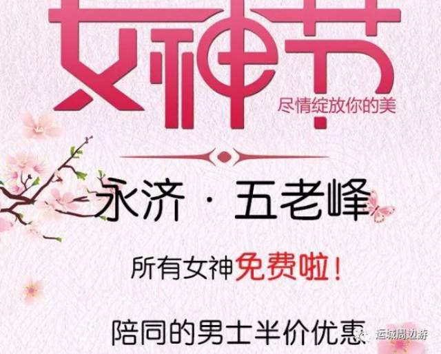 活动内容:女士免费 永济 神潭大峡谷 注:以上优惠内容包括景区门票及《梦回三国》实景剧 活动时间:2019年3月8日 半价!半价!半价! 活动时间:2019年3月8日 活动内容:永济女性免费,其它女性朋友半价 神潭动物园 3月8、9、10日 二大一小50元、一大一小30元 算下来能省不少钱呢