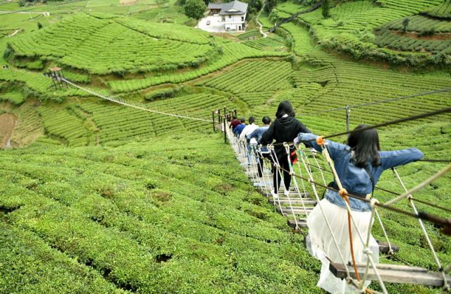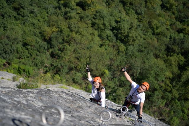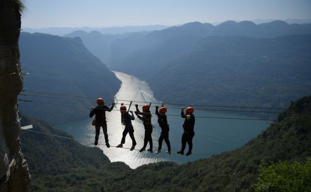 ↑游人在湖北省建始县花坪镇鸡公岭飞拉达攀岩户外运动基地走钢丝桥。新华社发(杨顺丕 摄) |