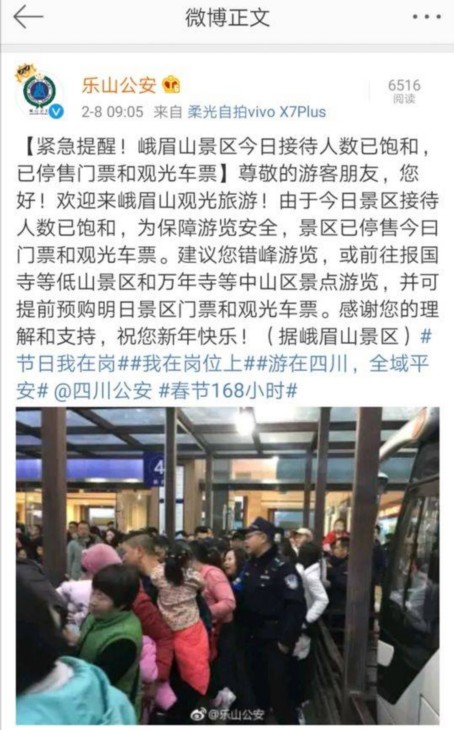 2月8日,大年初四,四川峨眉山景区再度爆满,暂时停售景区门票和观光车票。 乐山市公安局官微“@乐山公安”提醒说,由于今日景区接待人数已饱和,为保障游览安全,景区已停售今日门票和观光车票。 建议游客错峰游览,或前往报国寺等低山景区和万年寺等中山区景点游览,并可提前预购明日景区门票和观光车票。 这是峨眉山景区连续第三天采取限流措施,2月6日、7日也因高山区游客饱和,暂时停售上山观光车票。 |
