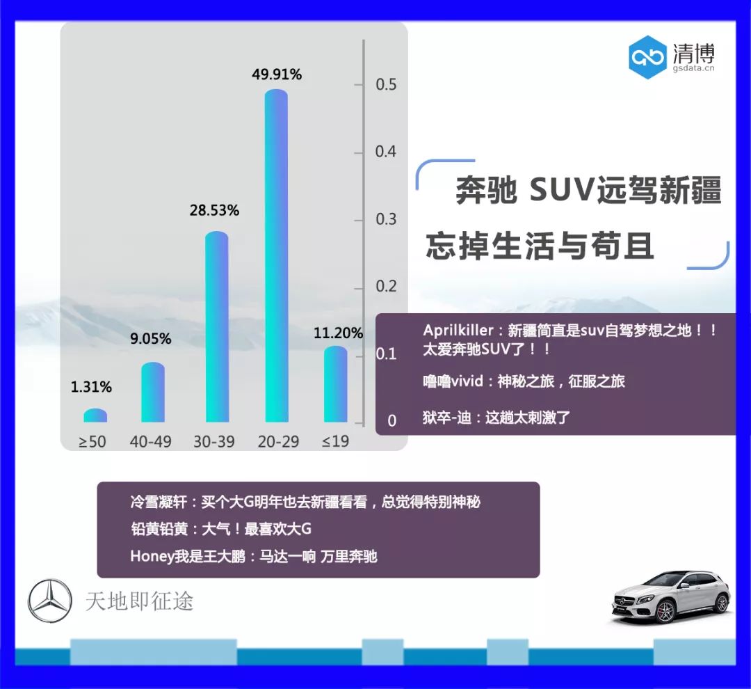 奔驰SUV家族征服新疆之旅,一路向北穿越1445km,这漫漫长征之路并不孤单。微博话题#天地即征途#带动大批网友一起“云”游新疆,触及多圈层消费者;知名旅游类KOL用“诗与远方”邀请更多人纵情山海,散发奔驰SUV品牌魅力;奔驰SUV家族专属推广页面,家族小兄弟们实力尽显,产品定位深入人心。无所畏惧,纵横天地,奔驰SUV组团新疆自驾游,约吗? 营销新说现已入驻 新浪微博丨新浪看点 搜狐新闻丨网易新闻 豆瓣丨一点资讯 (来源:营销新说) |