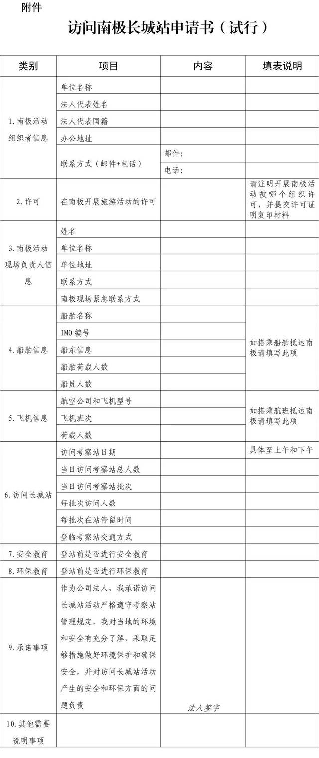 2.按照船舶航线和登岸计划,提交中英文环评; 3.做出安全、环保责任自负的书面承诺并由法人代表签字; 4.提交承租船舶获得相关国家管理部门批准开展极地旅游活动的许可; 5.提交旅游企业营业执照和经营许可证; 6.提交旅游企业与承租船舶的南极船期合同。 申请书长这样↓↓↓