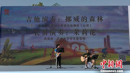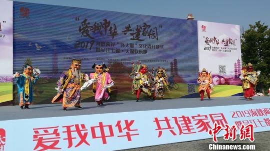 张博明是苏州大学的台湾交换生。他笑言,吸引自己来大陆的最大动力是希望可以在大陆各地游览。“我是历史专业的,之前在台湾时,从书中读到历史故事,总感觉隔着一层纱。来到大陆后,我去一趟西安,看着大雁塔的那一刻,我感受到;‘啊,这就是唐僧取经回来的地方’。书中原本虚幻的历史在我心里一下子变得真实起来。” 张博明与大陆同学一道在开幕仪式上表演。 钟升 摄 中新网苏州9月28日电 (记者 钟升)28日早晨,在苏州市七都镇,伴随着“电音三太子”的歌舞声,等待已久的台胞们一道跨上单车,开始了为期3天的环太湖之行。当天,2019海峡两岸“环太湖”文化周正式启幕。活动期间,将有约2000名来自江苏、浙江两地的台胞参与其中,与大陆民众一道赏太湖美景、品湖鲜美味。 现在,张博明已经去过了北京、西安、云南等地,饱览当地美景、遍历历史古迹。他期望这次活动能加深他对江南地区的了解,让他更加热爱这片土地。(完) 台湾风情浓厚的“电音三太子”表演。 钟升 摄