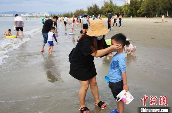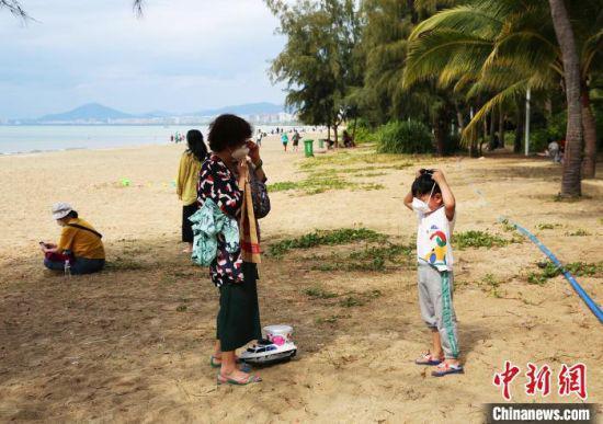记者连日来在三亚湾海边看到,不少游客戴上了各式防护口罩。看到戴口罩的人越来越多,一位年轻的母亲从包里翻出口罩,“威逼利诱”给孩子带上。 在三亚市天涯区春园社区、吉阳区河东社区等多个卫生健康服务中心,医护人员和社区工作者加班加点,为市民游客免费发放口罩。