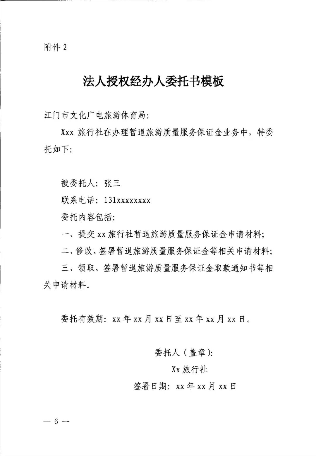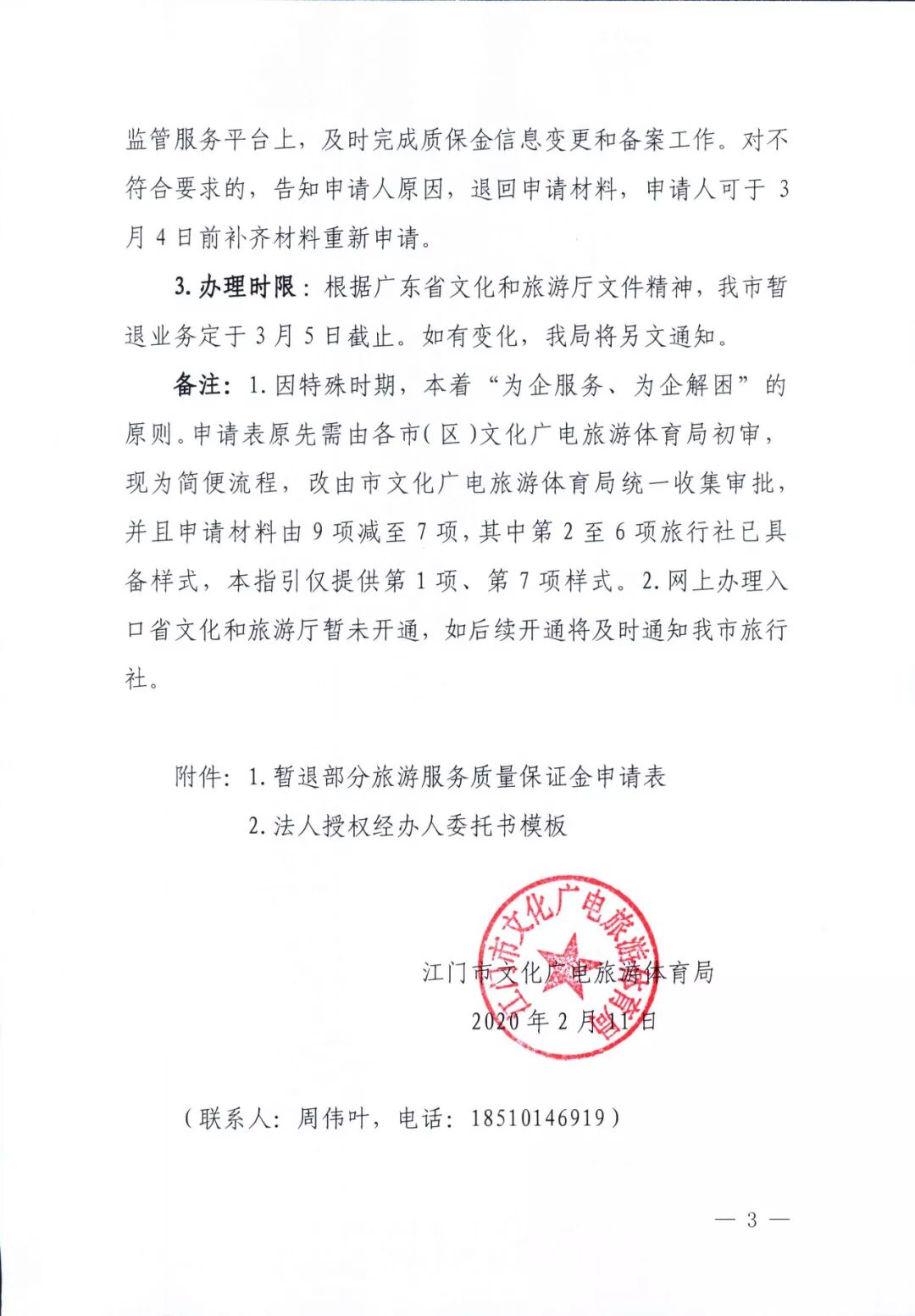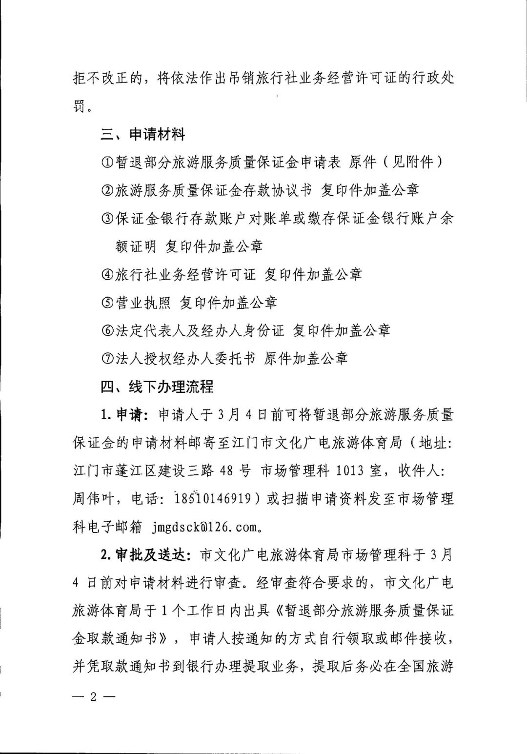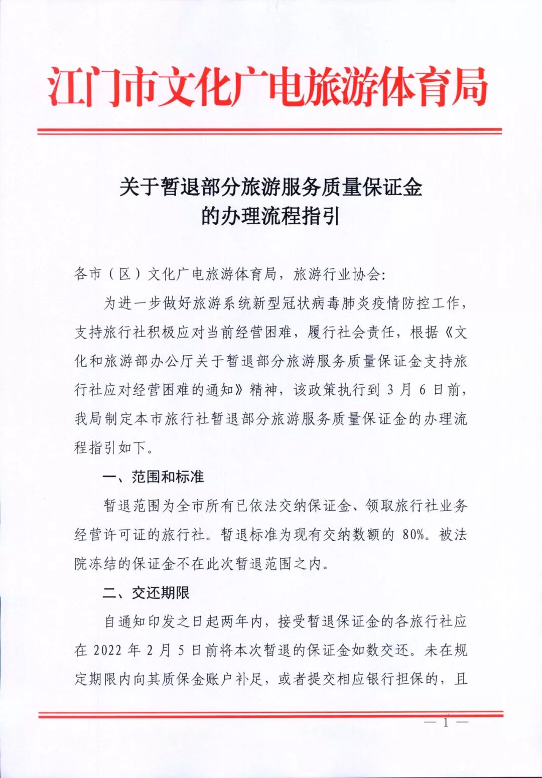 主动服务迅速响应!江门市文化广电旅游体育局出具首份《暂退部分旅游服务质量保证金取款通知书》 2月11日,江门市文化广电旅游体育局出具了首份《暂退部分旅游服务质量保证金取款通知书》,帮助旅行社减轻疫情影响,缓解资金压力。领到首份取款通知书的是江门市大方旅游国际旅行社有限公司(下称“大方旅游”),因该公司组织架构涉及江门、广州、珠海三个城市,为尽快帮助企业拿到取款通知书,减少在疫情防控期间返回多个城市办理的时间,江门市文化广电旅游体育局积极与广州市文化广电旅游局、珠海市文化广电旅游体育局联系,两局均表示给予大力支持,无需企业“来回跑”,在江门完成“一次办理”。 为贯彻落实文化和旅游部办公厅《关于暂退部分旅游服务质量保证金支持旅行社应对经营困难的通知》和江门市人民政府《关于应对新型冠状病毒肺炎疫情支持企业复工复产的若干措施》,积极应对新型冠状病毒肺炎疫情,缓解旅行社应对在疫情期间经营困难情况,江门市文化广电旅游体育局制定了《关于暂退部分旅游服务质量保证金的办理流程指引》,于2月10日起依旅行社申请开展暂退部分旅游服务质量保证金工作,2020年3月5日前完成暂退保证金工作。申请人可以通过邮寄或发邮件的方式提交资料,经审查符合要求的,市文化广电旅游体育局将在1个工作日内出具《暂退部分旅游服务质量保证金取款通知书》,申请人凭取款通知书到银行办理提取业务。 此次暂退范围共涉及我市74家旅行社。暂退范围为全市所有已依法交纳保证金、领取旅行社业务经营许可证的旅行社。暂退标准为现有交纳数额的80%。被法院冻结的保证金不在此次暂退范围之内。 对于上述支持政策,各大旅行社均表示非常有利于旅游业的恢复。大方旅游副董事长林超表示,疫情使得整个公司旅游业务受到重创,目前公司整体挑战还是比较大的。当前旅行社最迫切需要解决的是现金流问题,因此市文化广电旅游体育局通过暂退部分旅游服务质量保证金的方式对于企业而言有实际帮助,可以有效缓解资金压力和当前经营困难,并为今后的恢复和发展创造条件。尤其是能为行业注入信心,让广大旅行社感受到温暖,各级各部门都在积极帮助旅游行业渡过难关。 关于暂退部分旅游服务质量保证金的办理流程指引