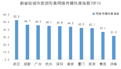 四、中国副省级城市旅游传播影响力 (一)副省级城市旅游形象网络传播热度指数TOP10 在统计时段,根据大数据抓取结果对15座副省级城市旅游形象网络传播热度指数进行排名,武汉市位列榜首,旅游形象网络传播热度指数达52.9;其次分别为成都、广州、杭州、深圳、南京、厦门、西安、青岛、济南。