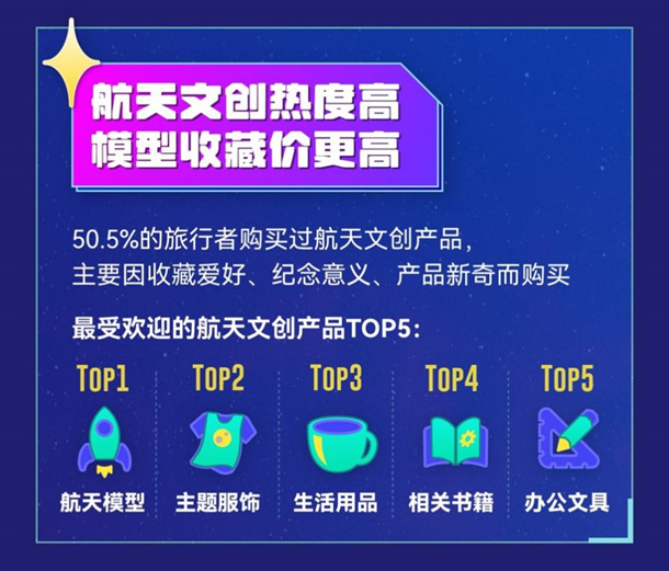 航天文创备受欢迎,模型及主题服饰排名前二 全民航天热也带火了航天文创产品,在淘宝发布的“2021年度十大商品”中,航天文创产品榜上有名,各类航天主题火箭、飞船、空间站模型等航天文创产品销量同比上涨数十倍。报告同样显示,超过一半的旅行者购买过航天文创产品,他们主要因收藏爱好、纪念意义、产品新奇而购买。而航天模型、主题服饰、生活用品、相关书籍、办公文具分列最受欢迎的航天文创产品前五。