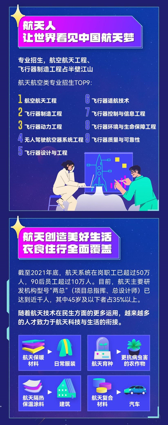 90后逐步撑起中国航天梦,航天技术覆盖衣食住行 中国飞天筑梦的过程充满了艰辛,随着中国空间站的全面建设,我国正逐步迈向航天强国。截至2021年底,航天系统在岗职工已超过50万人,90后员工超过10万人。目前,航天主要研发机构型号“两总”(项目总指挥、总设计师)已达近千人,其中,45岁及以下者占比超过35%。青年人才的培养也在不断开展,航天航空类专业招生中,航天航空工程、飞行器制造工程等专业占比超过50%。 此外,航天技术越来越多的运用在民生方面。如气凝胶运用于日常服装保暖,通过航天育种培育更抗病虫害的农作物,复合材料用于汽车结构零部件等。