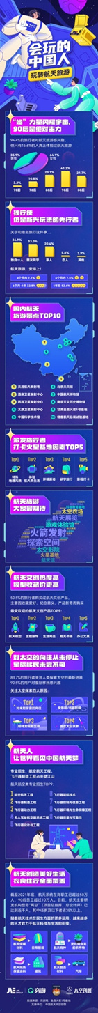 近年来,随着“祝融”号登陆火星,首颗太阳探测科学技术试验卫星“羲和号”的发射等一系列中国航天大事件,在国内掀起了航天热,与之相关的航天主题旅游热度也不断攀升,成为旅行者的新选择。自2020年起,穷游网一直关注航天旅行,策划推出了多个太空探索相关活动,及发射场研学旅行产品。7月5日,穷游网联合金昌火星1号基地,并在中国航天太空创想的支持下,共同发布《会玩的中国人:玩转航天旅游》大数据报告,穷游网创始人兼CEO肖异对外揭秘航天旅游这一新兴旅行方式,同时分享了其对航天文旅未来发展的洞察。 数据显示,航天旅游市场空间巨大,但体验者较少且多为年轻人,他们更愿意独自尝试该玩法,非常期待能在旅行时观摩火箭发射、探索空间等体验,对于航天文创产品,特别是航天模型热度非常高。
