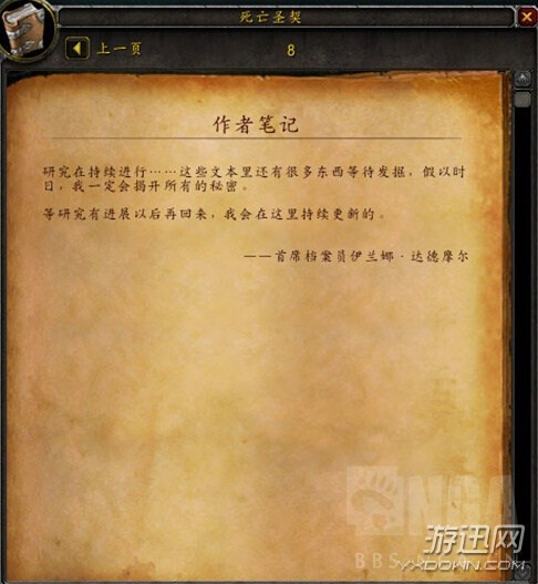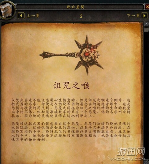 “这些只是我们黑锋骑士获得的三件神器的基础背景故事。研究在持续进行……这些文本里还有很多东西等待发掘。假以时日,我一定会解开所有的秘密……”——首席档案员,伊兰娜 · 达德摩尔 血DK神器诅咒之喉: