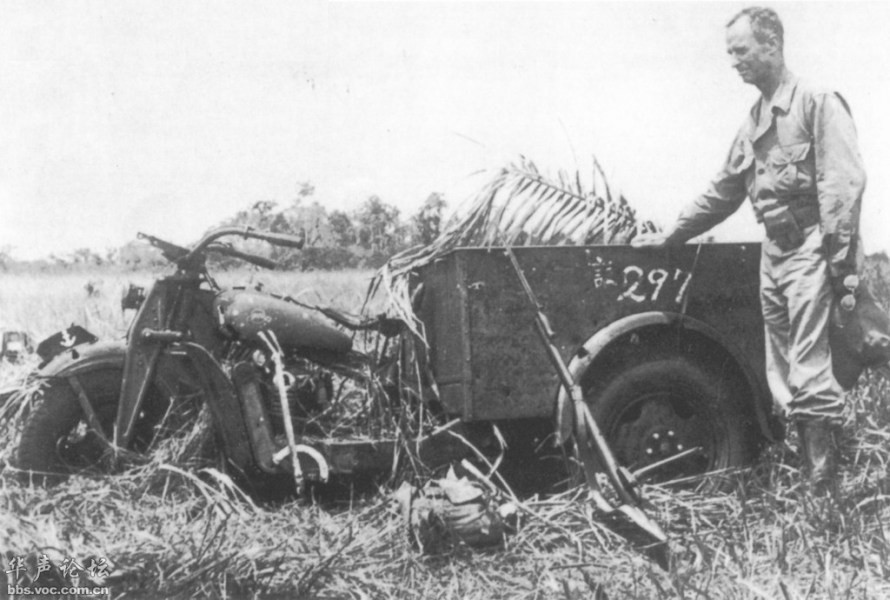 美军在南方战场缴获的一式三轮摩托车。