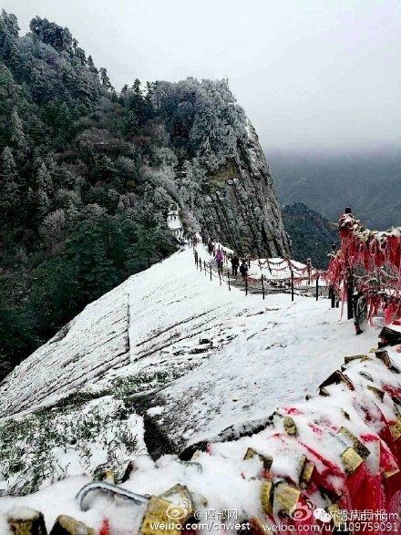 来源/西安晚报 校对/周 佳 当天早上8时许,华山景区各主峰区迎来降雪,虽然,还是深秋季节,有的地方下的积雪很快被融化,但大部分建筑草木已被积雪覆盖,积雪最厚达5公分,北峰有的地段已结上了长长的冰溜,加之山中仍有绿色植被衬托,仿佛将人置身于仙境,吸引众多中外游客争相拍照。一位游客说,他在北峰拍了许多华山雪景,带回去和家人朋友共同分享,还堆了雪人。 华山景区雪天道路湿滑也给上下山的游客带来了不便,对此,华山景区也加大了道路安全巡查力度,组织道路沿线工作人员及时清理清除道路上的积雪,并提醒游客注意安全。( 来源:西安晚报)
