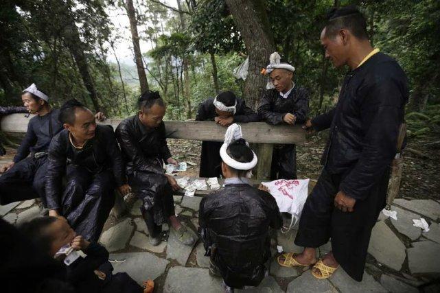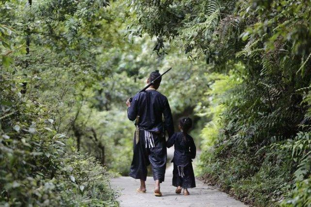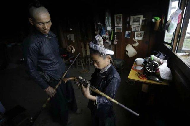 表演后,这些岜沙的汉子聚在一起分钱。 一位岜沙的老人背着枪带着孙子去散步,如今当地的年轻人大多离开这里去了大城市生活,当地持枪的传统可能难以为续。