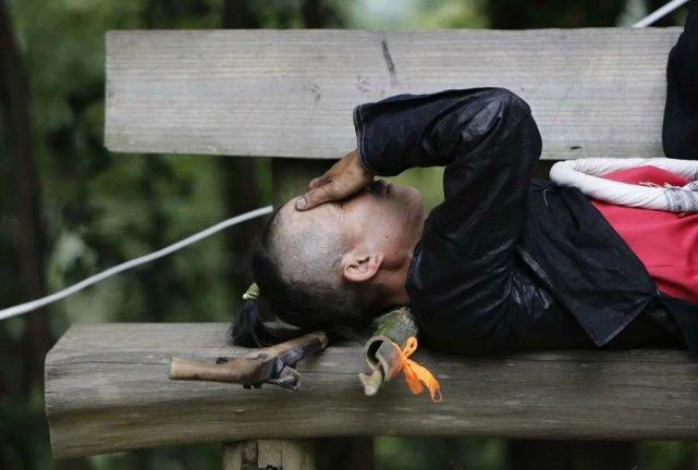 睡在长凳上的岜沙人,他头下枕着枪和芦笙,这里每个男人都是吹芦笙的高手。