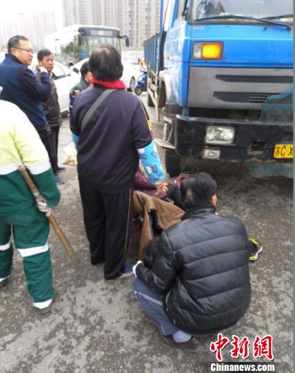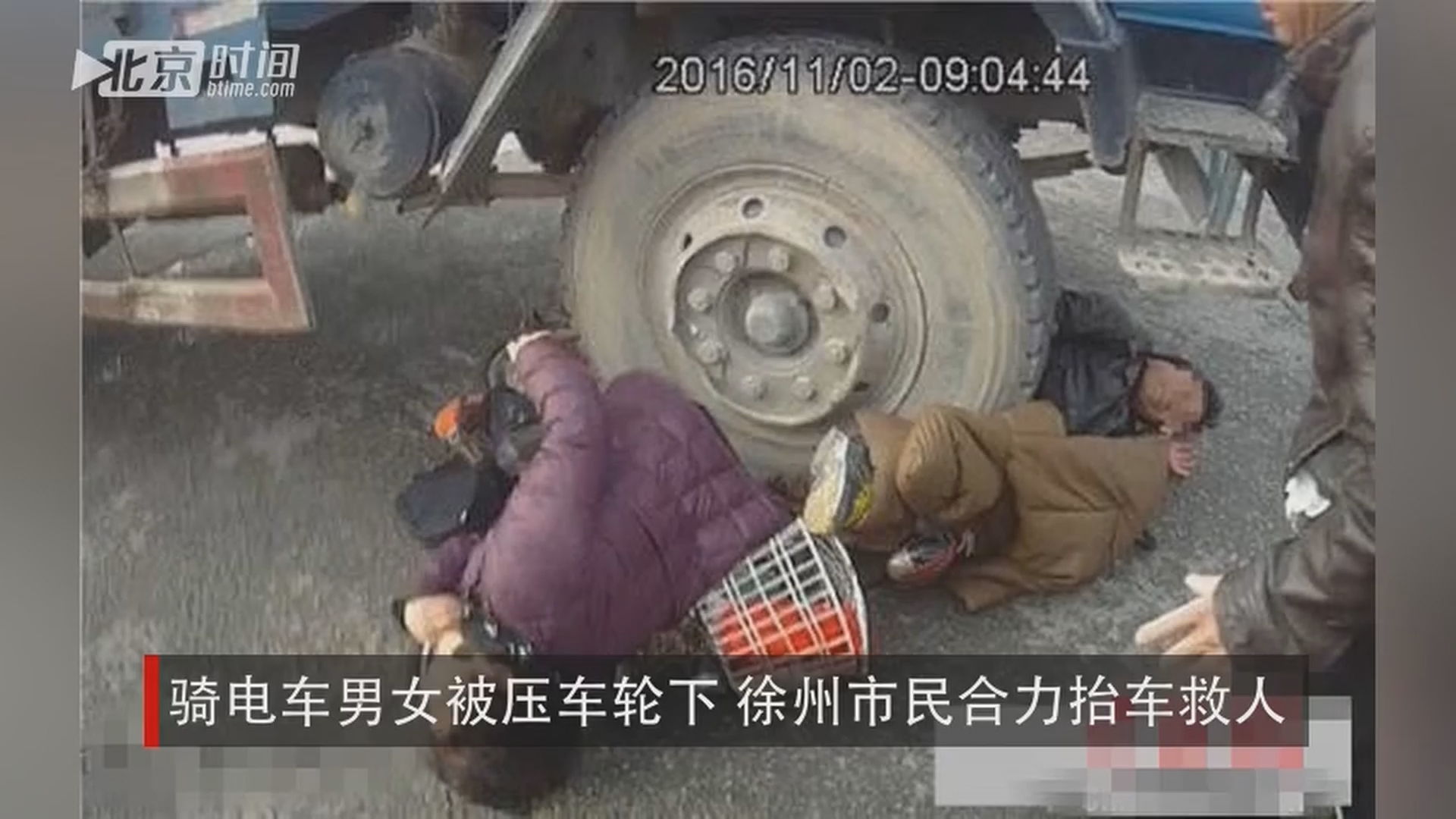 11月2日上午,徐州市和平路万达附近,一辆大货车在右转时将骑电车的一男一女碾压在右前车轮下,徐州市云龙区交警赶到现场组织群众一起抬车,上演了一场众人抬车救人的感人一幕。 骑电车男女被压车轮下 徐州市民合力抬车救人