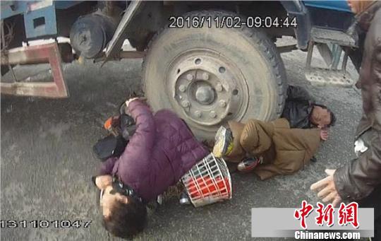 众人合力抬车将人救出。 警方供图 摄 骑电车男女卡在大货车前轮下。 警方供图 摄 当日上午9时许,在和平路万达附近路口,一辆大货车在右转弯过程中,对骑车人躲避不及,将电车连同车上一男一女碾压在右前车轮下。卡车司机立即停车,车轮卡在两人身上,此时轮胎只要向前或向后稍微移动都会对两人造成二次伤害。 |