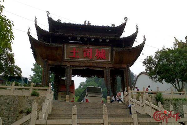 土司城入口 进入土司城,首先看到土司城迎宾仪式,土家汉子迎宾鼓,吹牛角、放冲,土家姑娘拦门歌,敬拦门酒,进入城内,在祭祀堂前举行百人土家大祭祖活动,男女老少唱摆手歌、跳摆手舞,登世界最高的吊脚楼九重天,参观土家族千百年来文化展示。到土家山寨,听土家歌,赏土家族最有代表风俗哭嫁,三棒鼓,花灯等民俗表演。